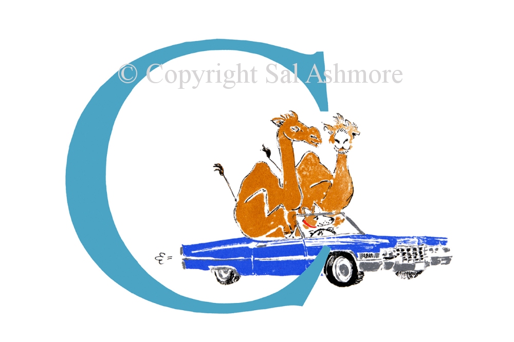 Story Letter Print C – Corgi and camels cruising in a Cadillac