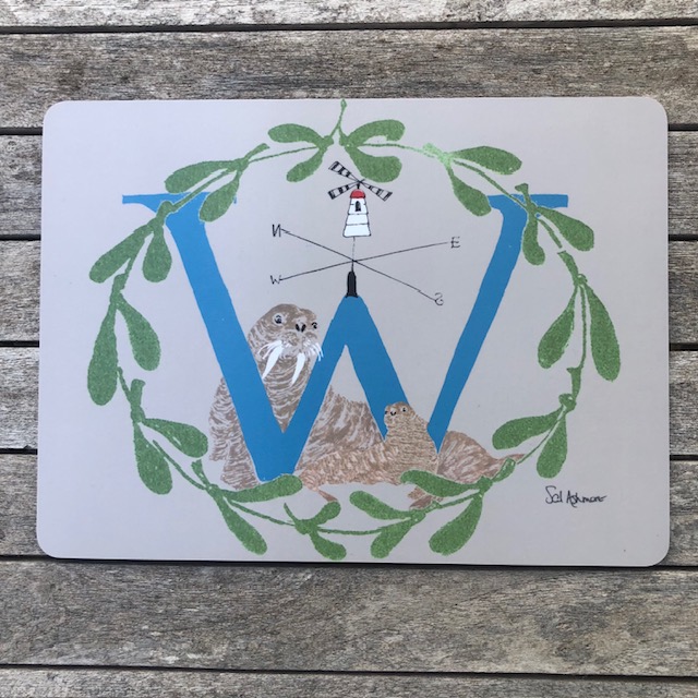 Light grey melamine cork backing placemat (size 21.8 x 29.4 x 4mm) depicting artist’s illustrated letter W with a walrus and a windmill.