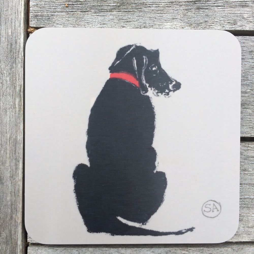 Grey melamine , cork backed coaster (100 x 100 x 3.2mm) depicting artist’s illustration of a black Labrador dog.