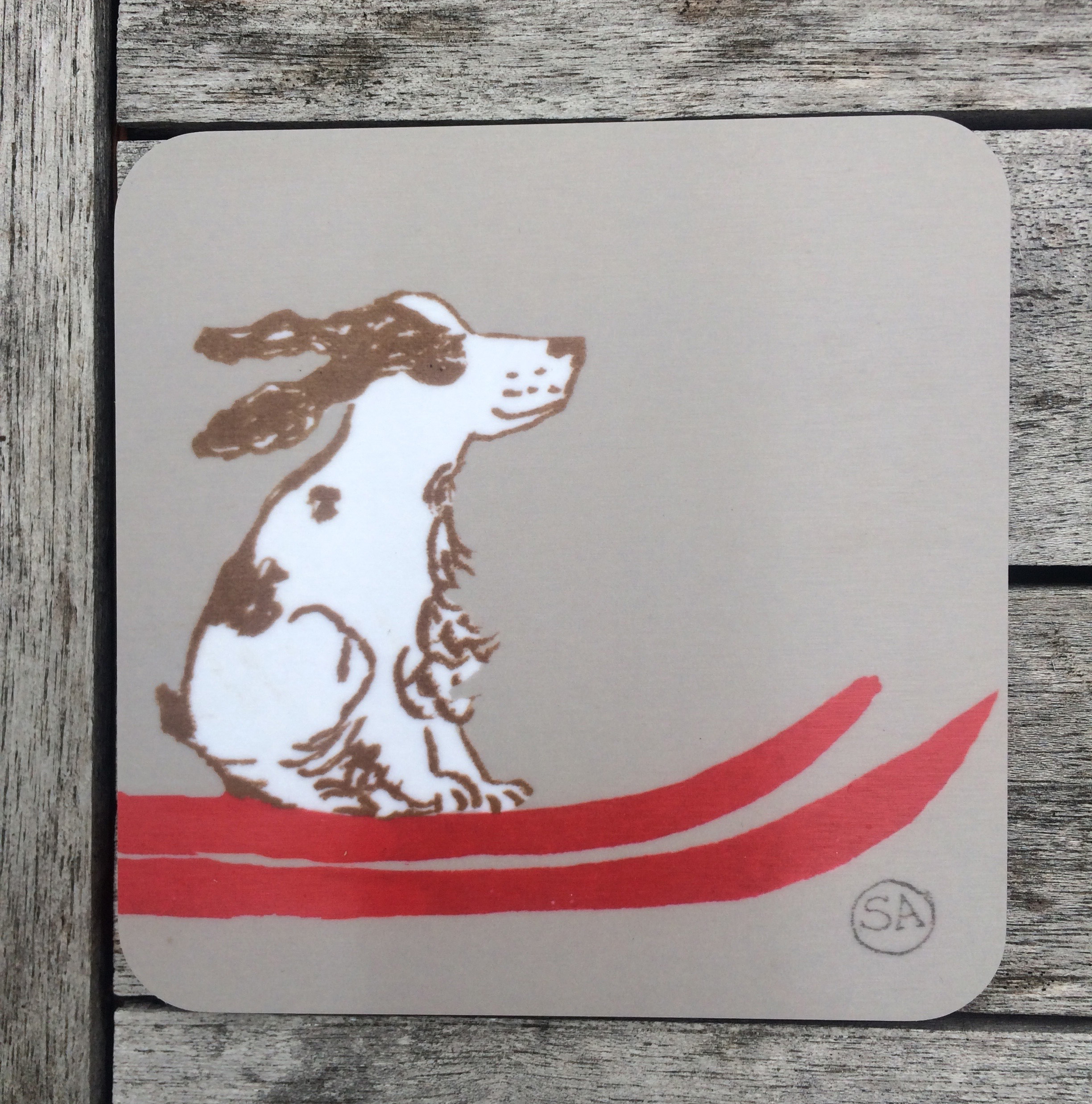 Light grey melamine with cork backing , coaster (size 100 x 100 x 3.2mm) depicting artist’s illustration of a spaniel on skis.